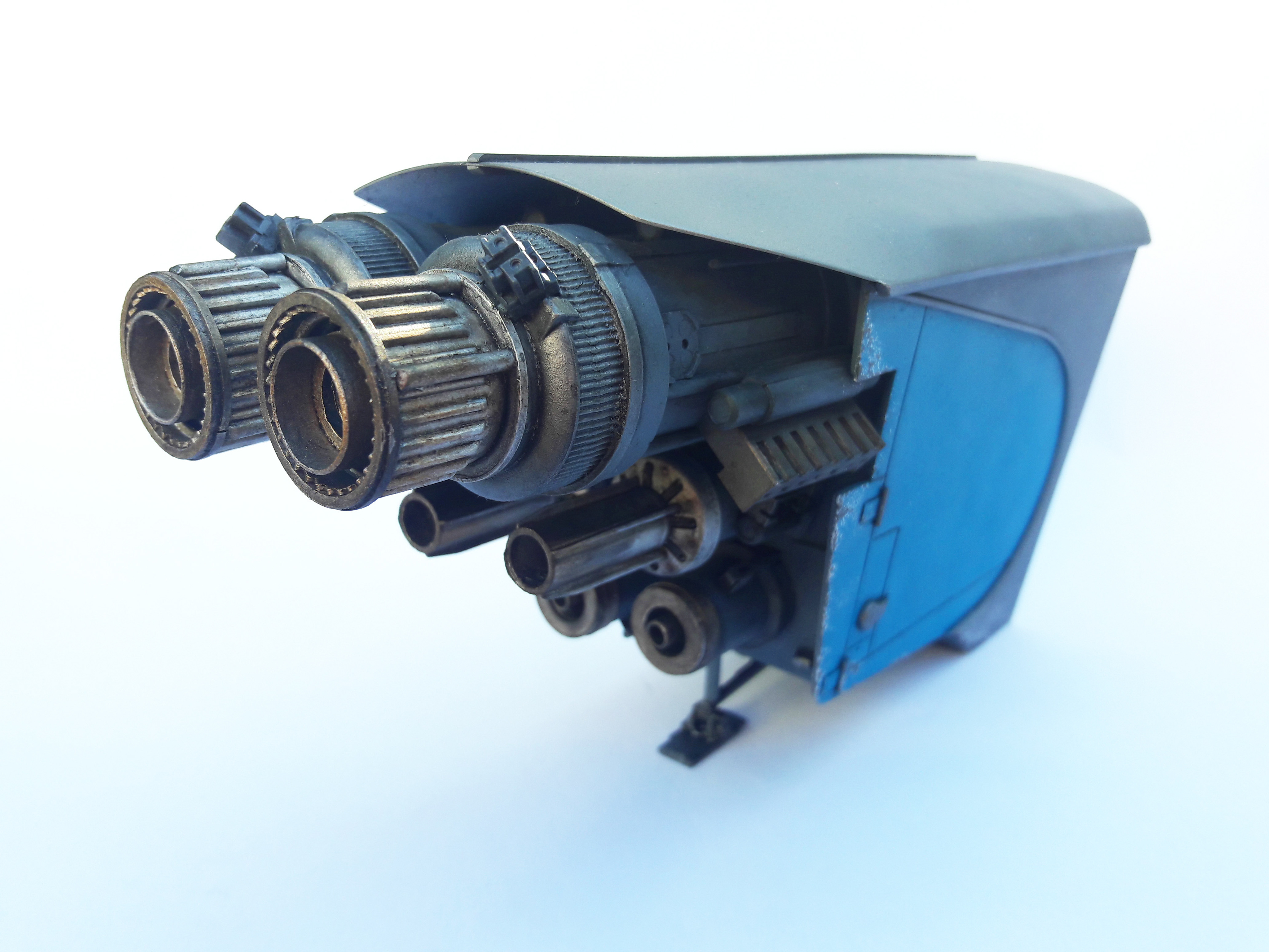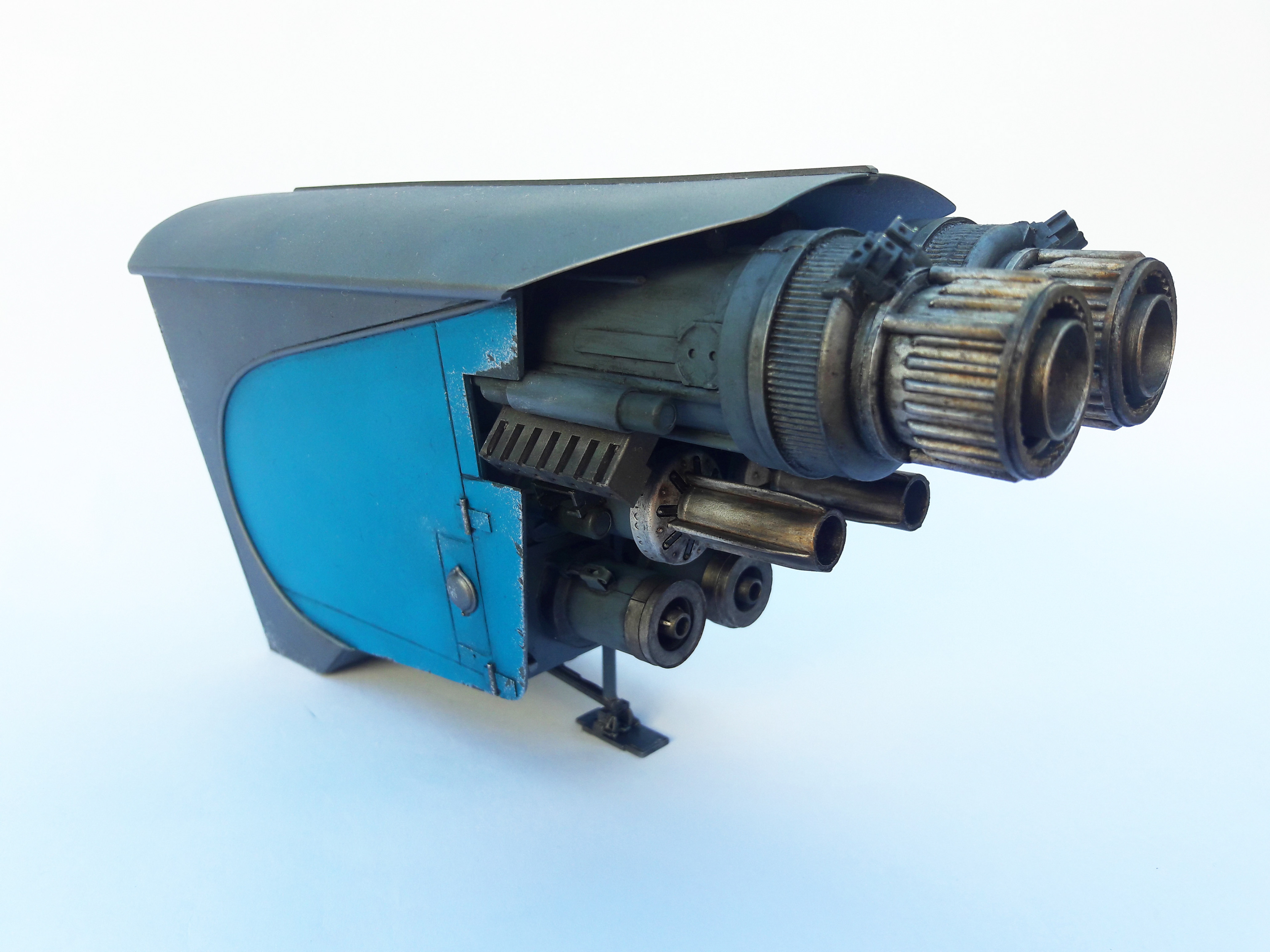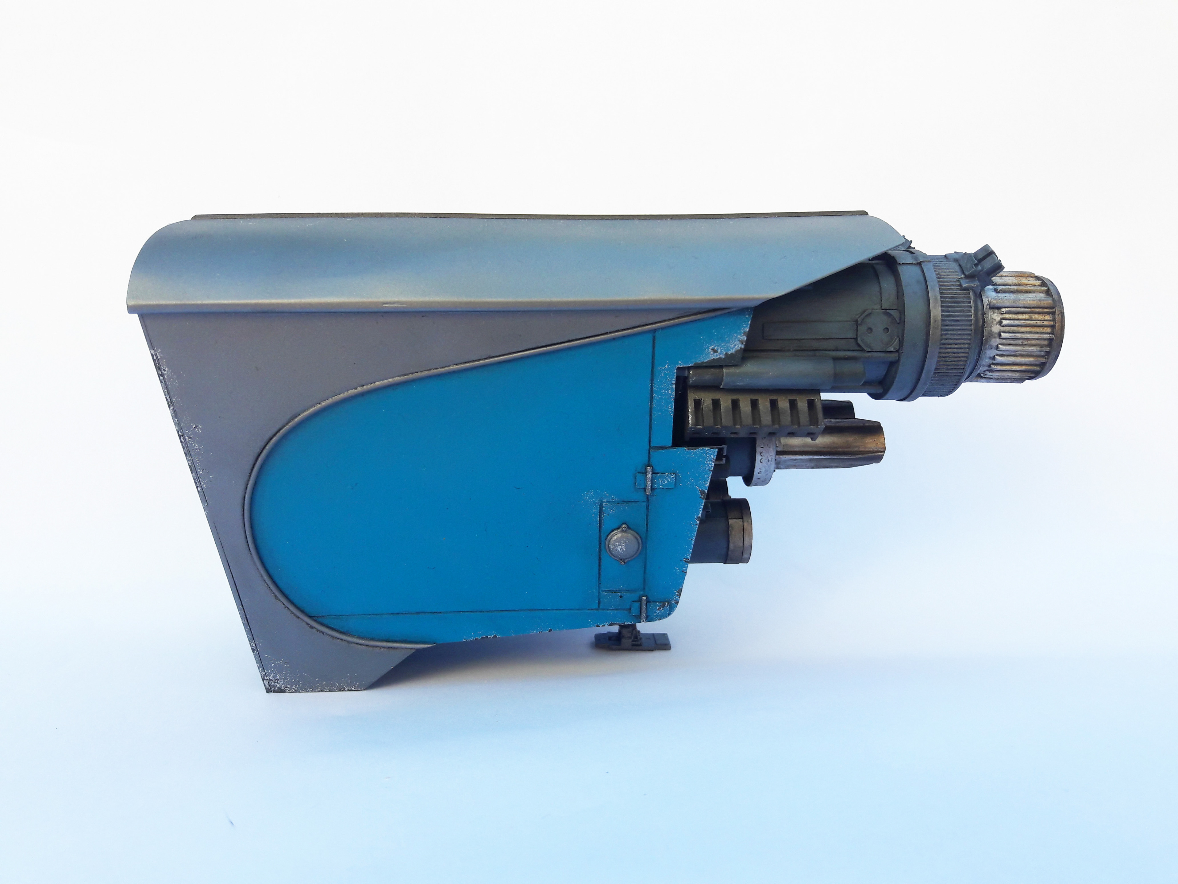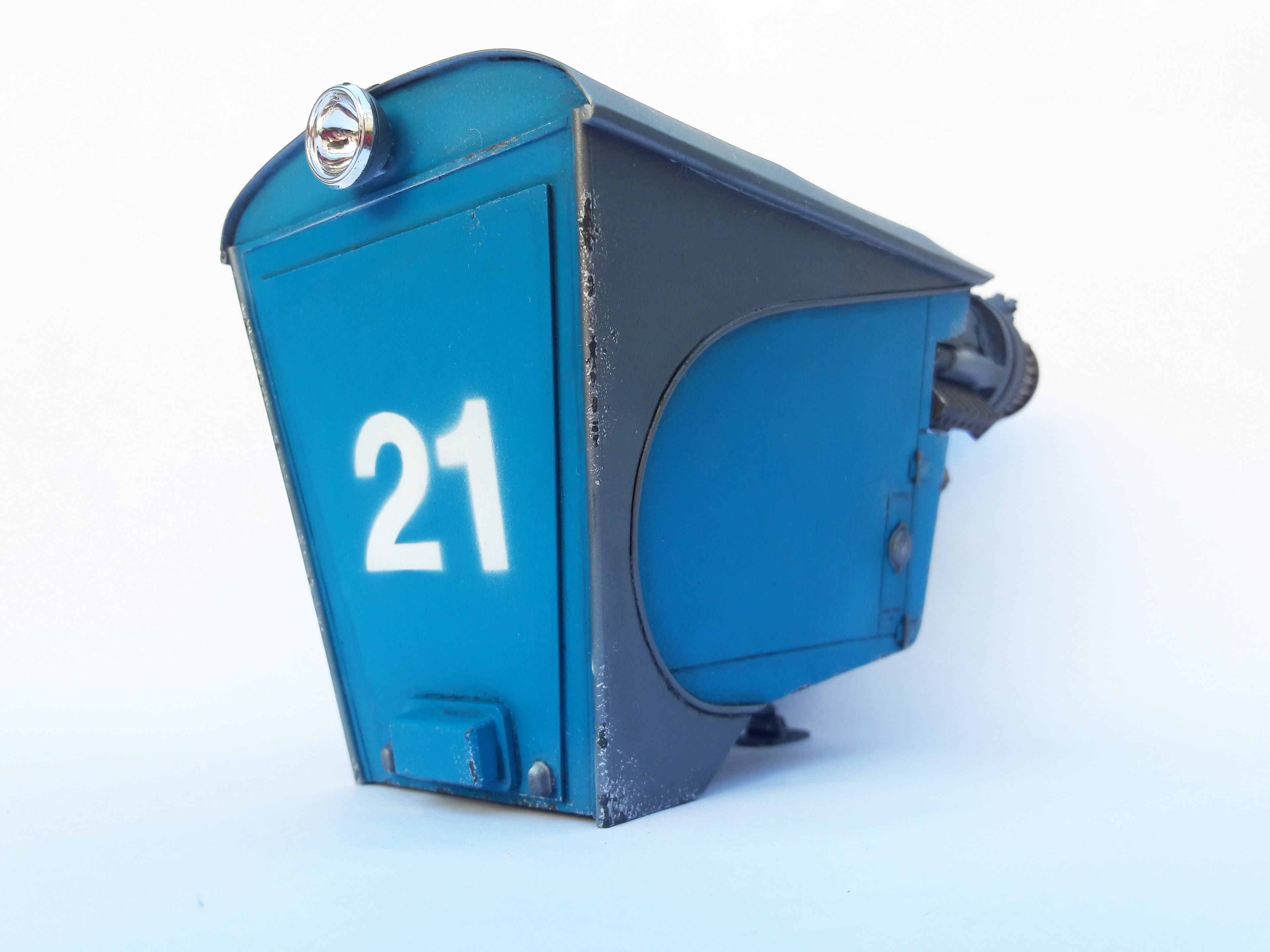 A streamline moderne rocket-powered postbox, scratchbuilt and kitbashed.