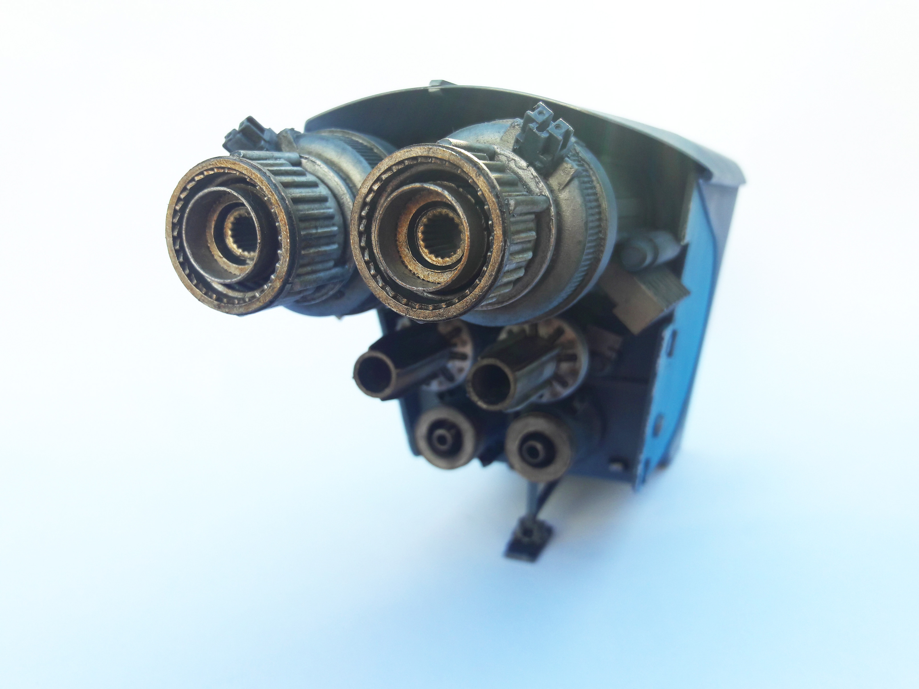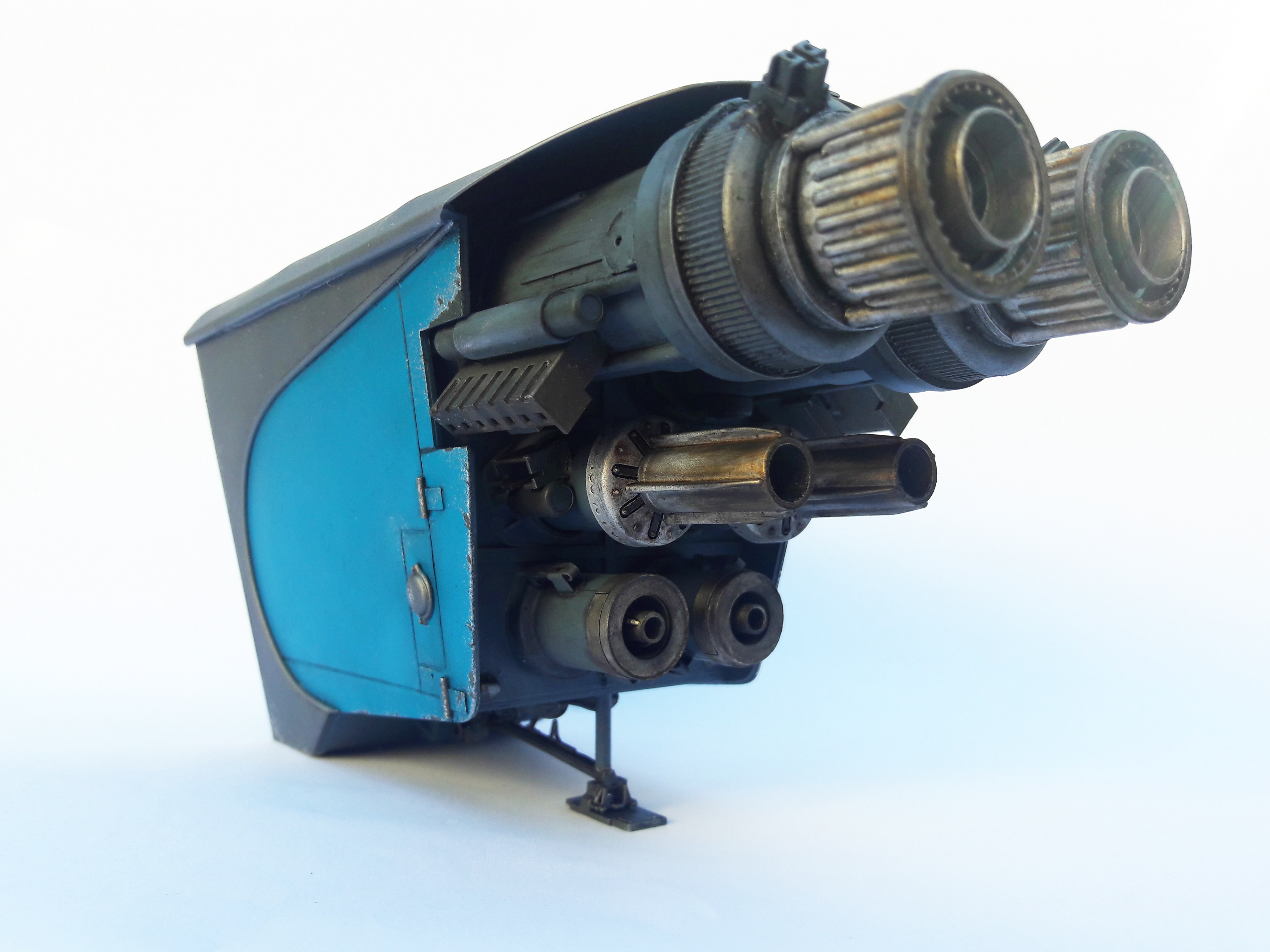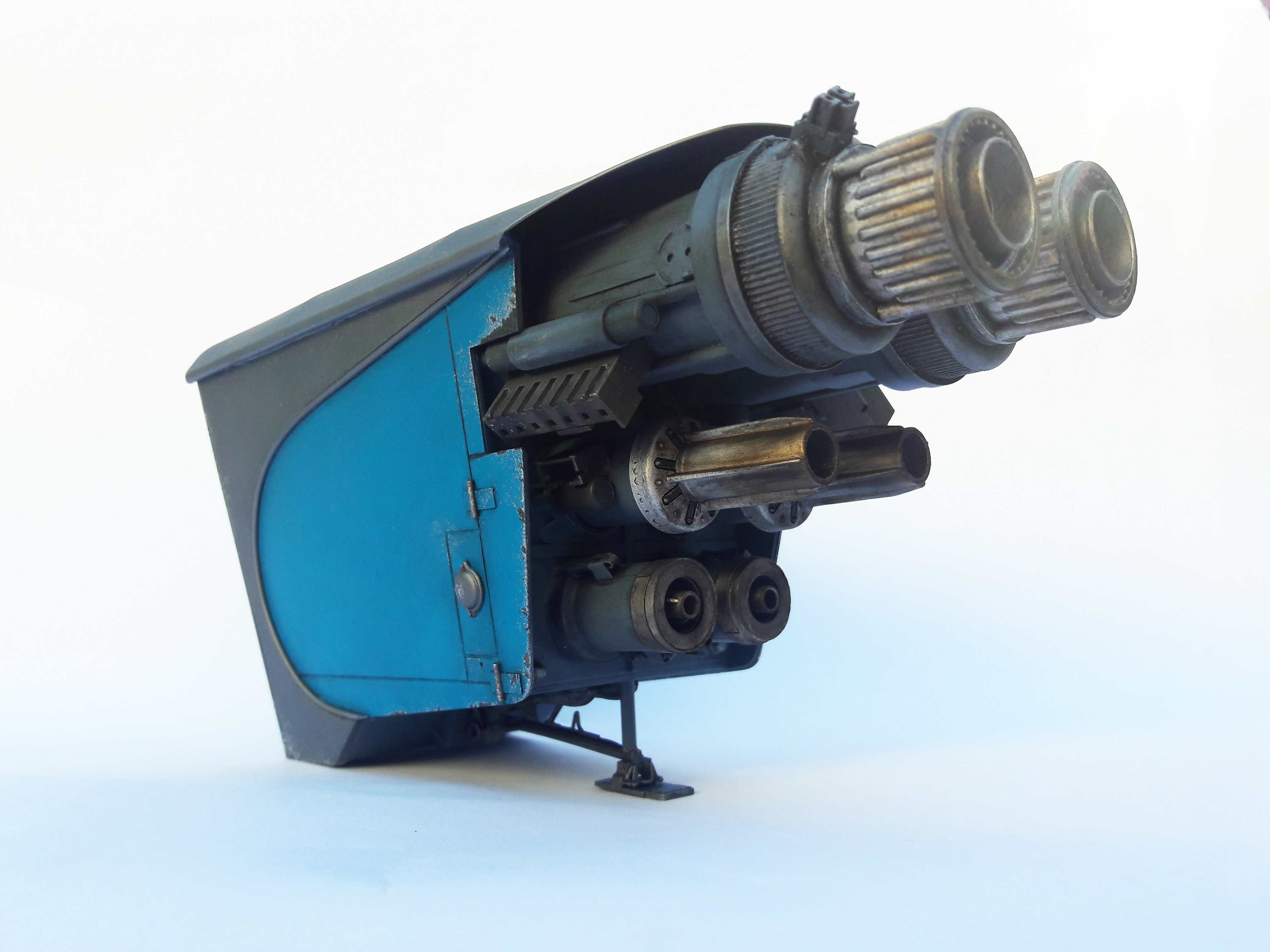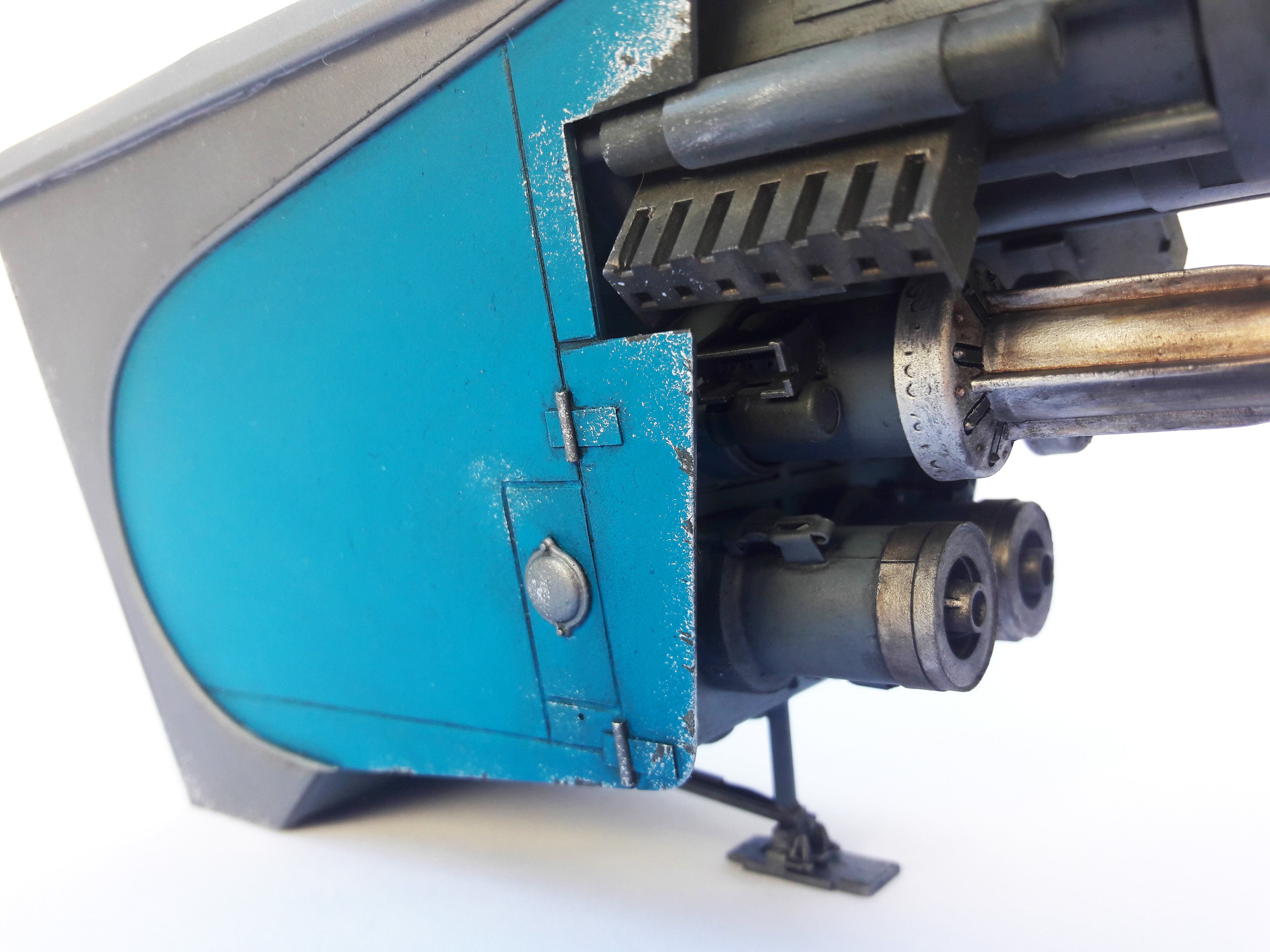 A streamline moderne rocket-powered postbox, scratchbuilt and kitbashed.